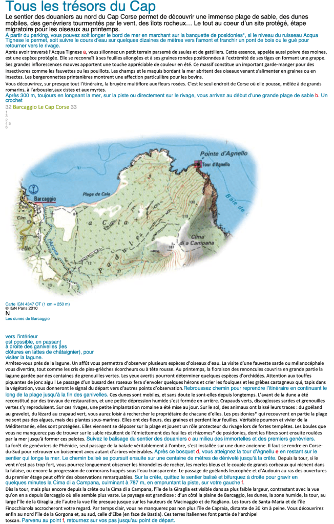 De la plage Tamarone, suivre le sentier vers la chapelle puis la baie de la Tour Santa Maria qui incite à un premier bain, prolonger vers la plage de Cala Francese puis passer les falaises pour la baie de capandola qui donne son nom à ce site protégé. Passer la pointe d’agnello, encore une plage et se dessine le port de Barcaggio.